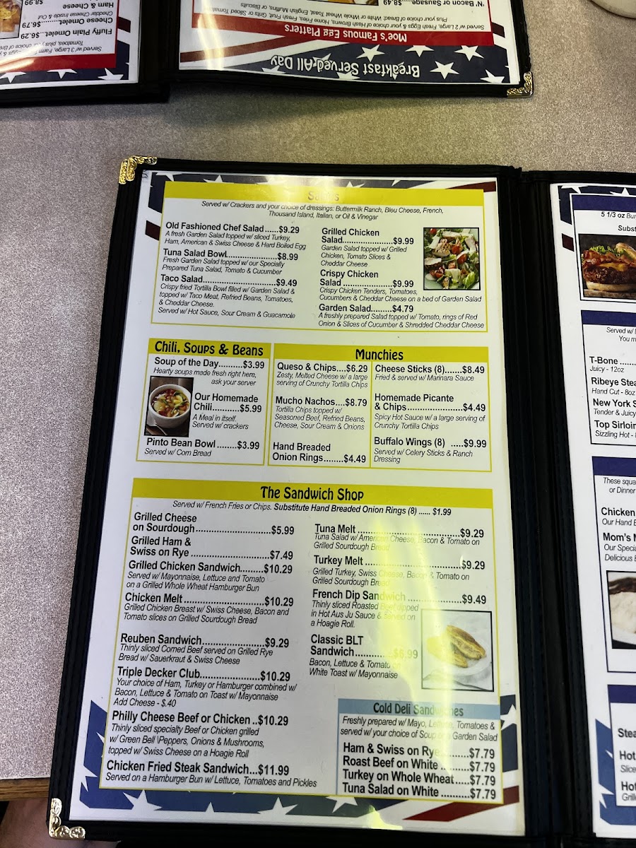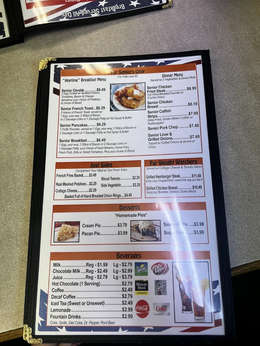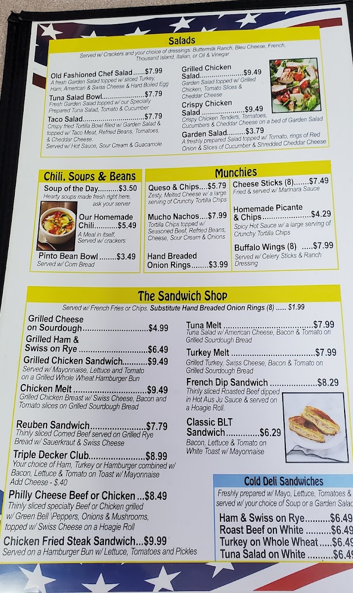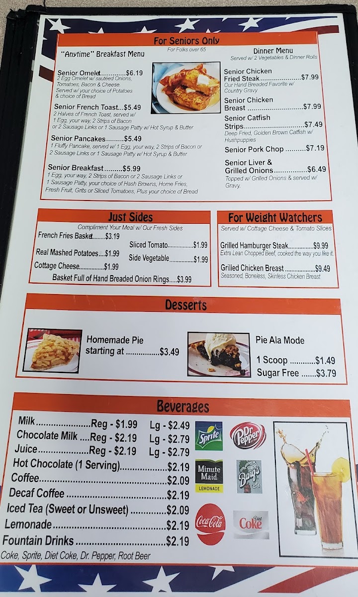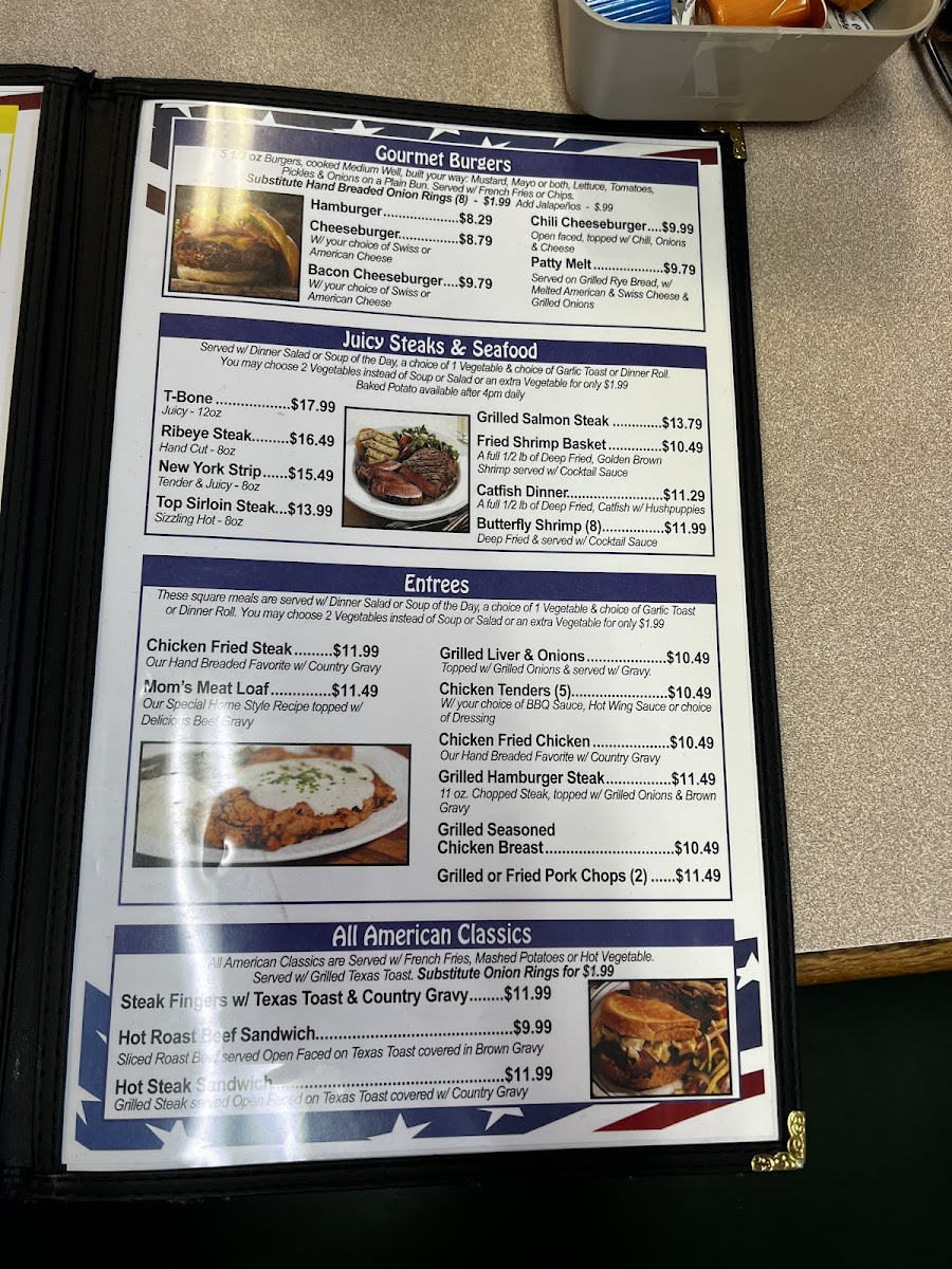 Pork chops with choice of fried or grilled. Eggs prepared to your preference including scrambled, poached, or boiled.